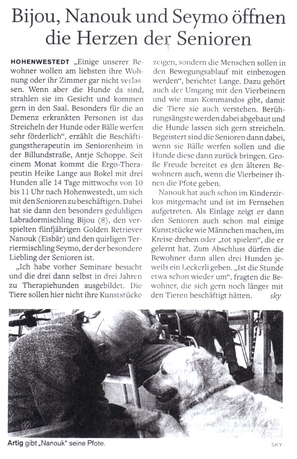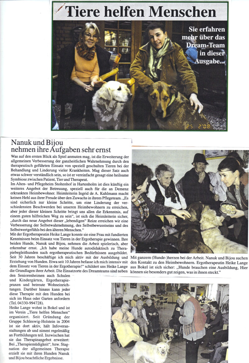 Seit 2002 Ergotherapietätigkeit mit meinen Therapiebegleithunden in diversen Seniorenheimen, Kliniken und Ergotherapiepraxen als freie Mitarbeiterin